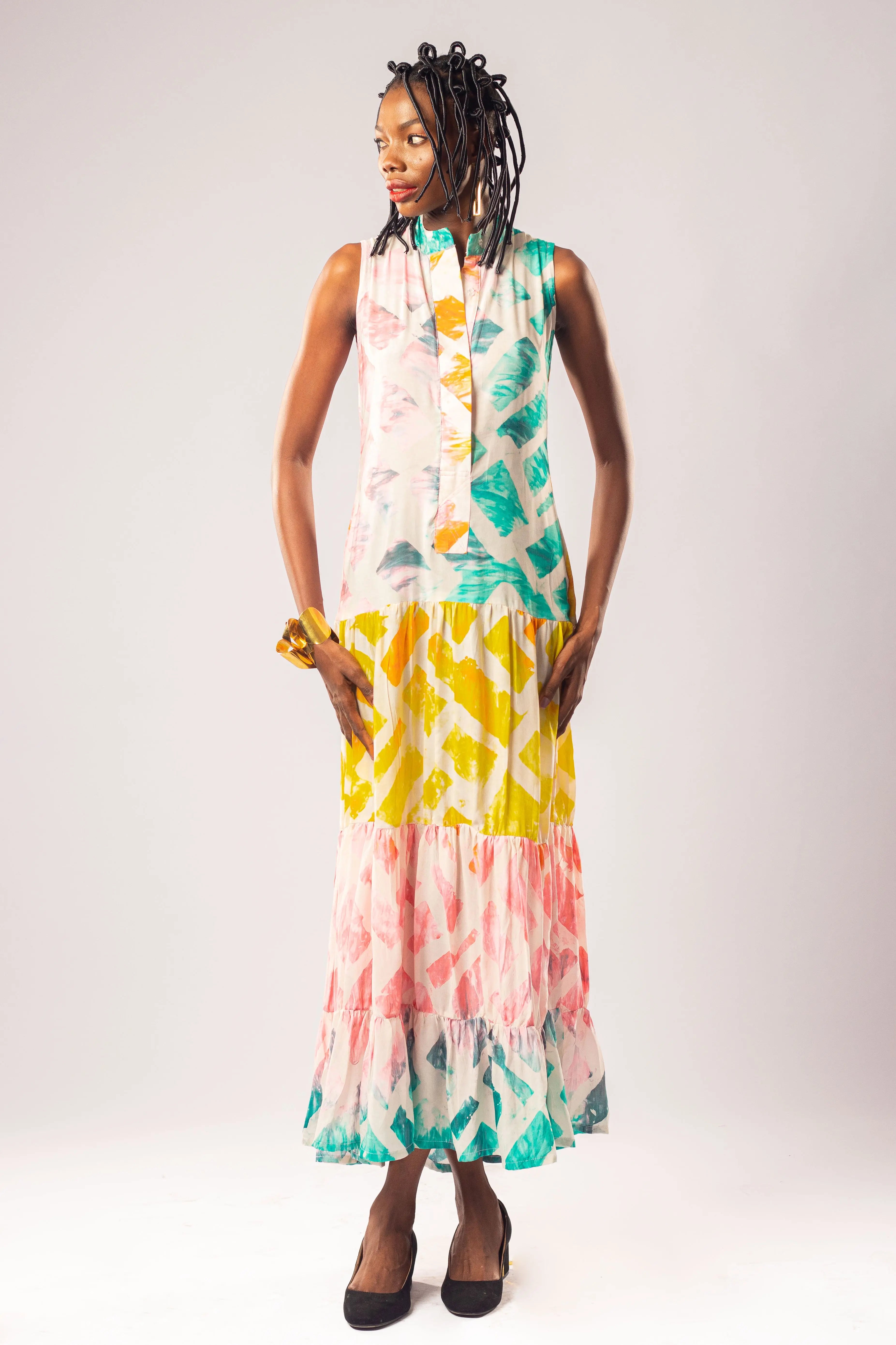 This piece features a wonderfully cheerful design, showcasing a painterly, abstract print that flows through color-blocked tiers in a fresh, sorbet-inspired palette of sunny yellow, candy pink, and cool mint. The...